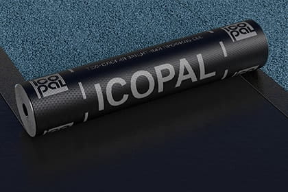 Рулонный битумно-полимерный СБС-модифицированный материал на нетканой основе из высокопрочного полиэстера с крупнозернистой посыпкой синего цвета на верхней стороне полотна.