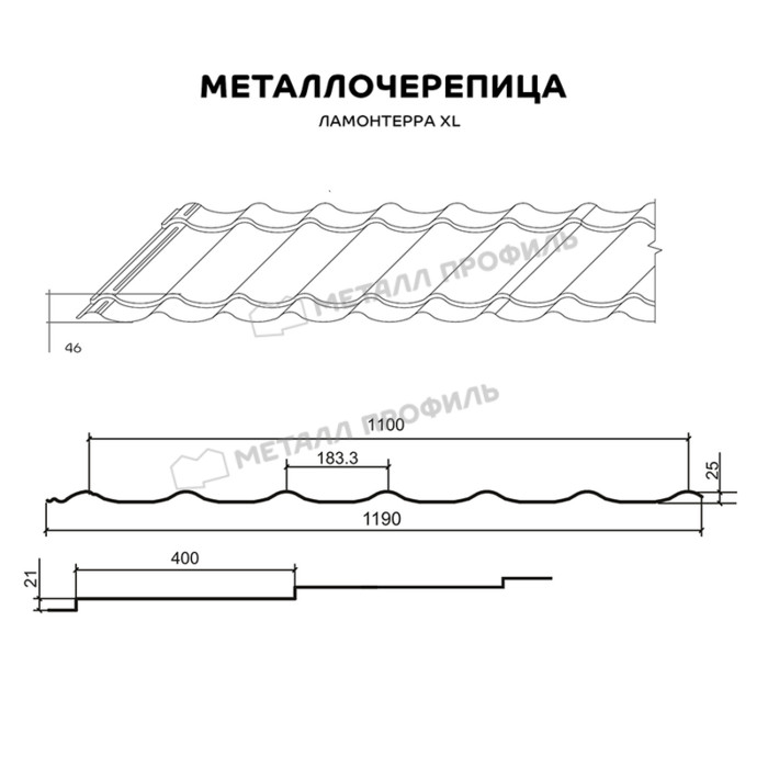 Если вам нужна классическая металлочерепица для больших кровель, обратите внимание на Ламонтерра® XL. Она характеризуется увеличенными габаритами: расстояние между волнами — 400 мм, высота ступенек — 21 мм. Большие асимметричные волны акцентируют геометрию ската и сделают крышу ещё более выразительной.