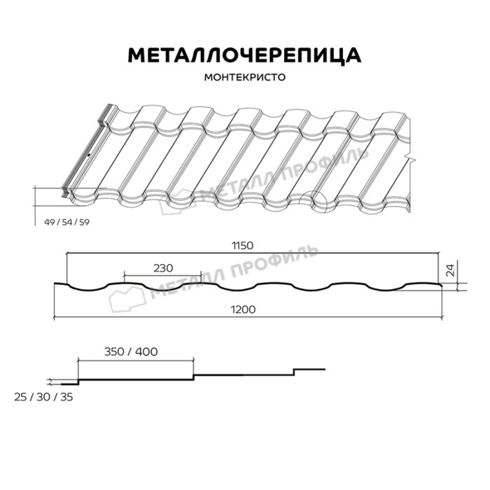 Металлочерепица МОНТЕКРИСТО — это совокупность строгих линий и скруглённых форм, которые отлично дополнят любое архитектурное решение — от модерна до минимализма. Новый профиль выгодно отличается от традиционной линейки металлочерепицы. Это и невидимые примыкания, полученные благодаря фигурной обрезке нижней кромки, и надёжная форма бокового замка, защищающая от протечек. Мы предлагаем покупателю возможность сформировать оптимальный вариант кровли. Подобрать вы можете не только длину листа (от 0,5 до 8 метров), но и глубину профиля (49/54/59 мм). Большой спектр сочетаний способен удовлетворить персональные запросы потребителя.